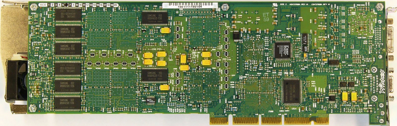 Card using AGP Pro 4x bus. Memory is divided to 64MB texture memory (2x64bit), 64MB Framebuffer (2x128bit) and 16MB DirectBurst cache (64bit).